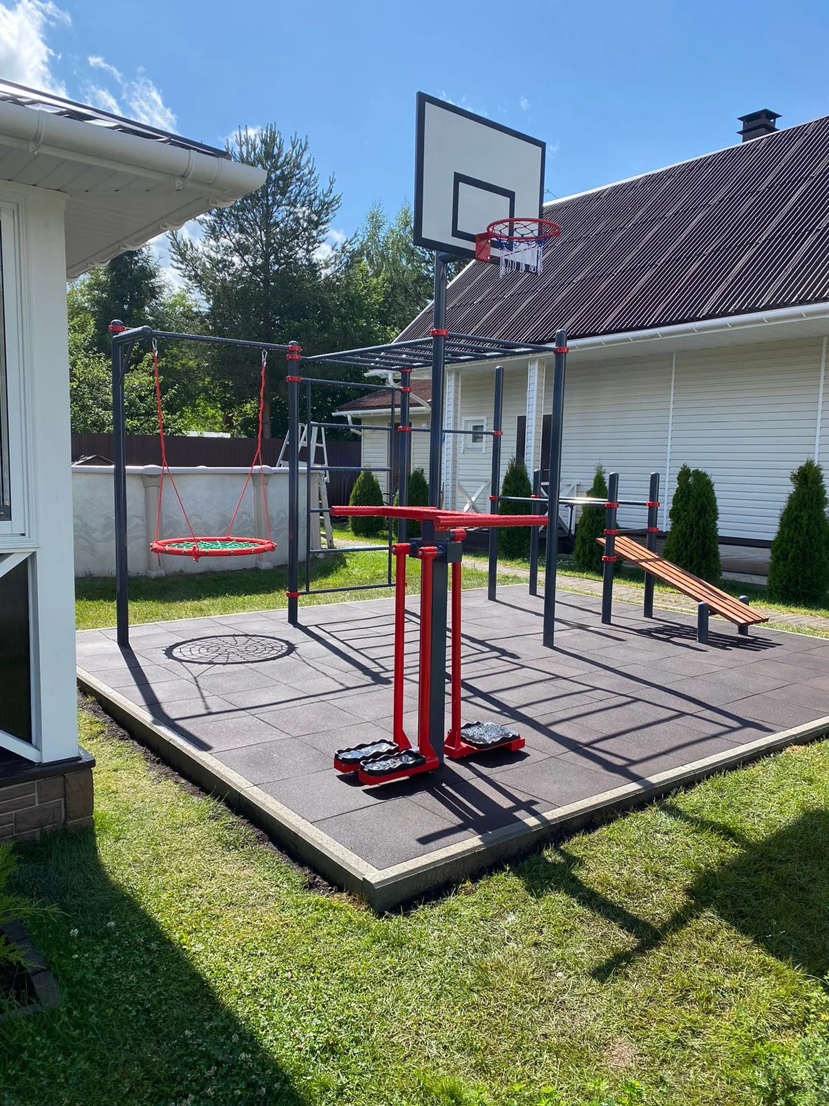 Рукоход, шведская стенка, турник ,брусья, скамья для пресса и баскетбольный щит. Добавление качелей в спортивный комплекс - это отличный способ сделать его более привлекательным и функциональным.